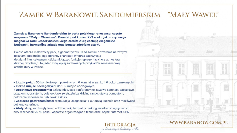 do niepowtarzalnych, renesansowych Zamków w Baranowie Sandomierskim oraz w Krasiczynie.
