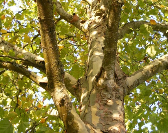 - Rodzina: Platanaceae - platanowateDrzewo do 35 m wysokości, z szeroką i rozłożystą koroną. Charakterystyczna kora łuszcząca się płatami i odsłaniająca jaśniejsze warstwy (kremowe, oliwkowe). Liście do 25 cm średnicy, dłoniasto klapowane, podobne do liści klonu pospolitego, od spodu pokryte brązowymi włoskami. Kwiaty: niepozorne z łuskowatym okwiatem, wiatropylne. Owoce, drobne orzeszki, zebrane w kuliste owocostany (2-3 cm śr.) na długiej szypułce. Drzewo długowieczne, odporne na warunki miejskie i rejonów przemysłowych. Cenne drzewo do obsadzania szerokich ulic, promenad i bulwarów. Rozrasta się szeroko i w starszym wieku tworzy malowniczą koronę.