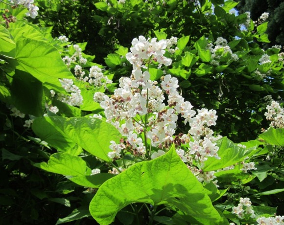 - Drzewo posiadające oryginalne szerokie owalne liście oraz białe kwiaty ozdobione czarnymi i żółtymi kropkami – przypominające kwiaty storczyków, a ich zapach odstrasza m.in. komary. Drzewa Surmy rosną zazwyczaj w nasłonecznionym środowisku. Dorastają do 10 m wysokości, rosną bardzo szybko - ok. 30 cm rocznie, przy czym korona drzew osiąga ok. 8 m